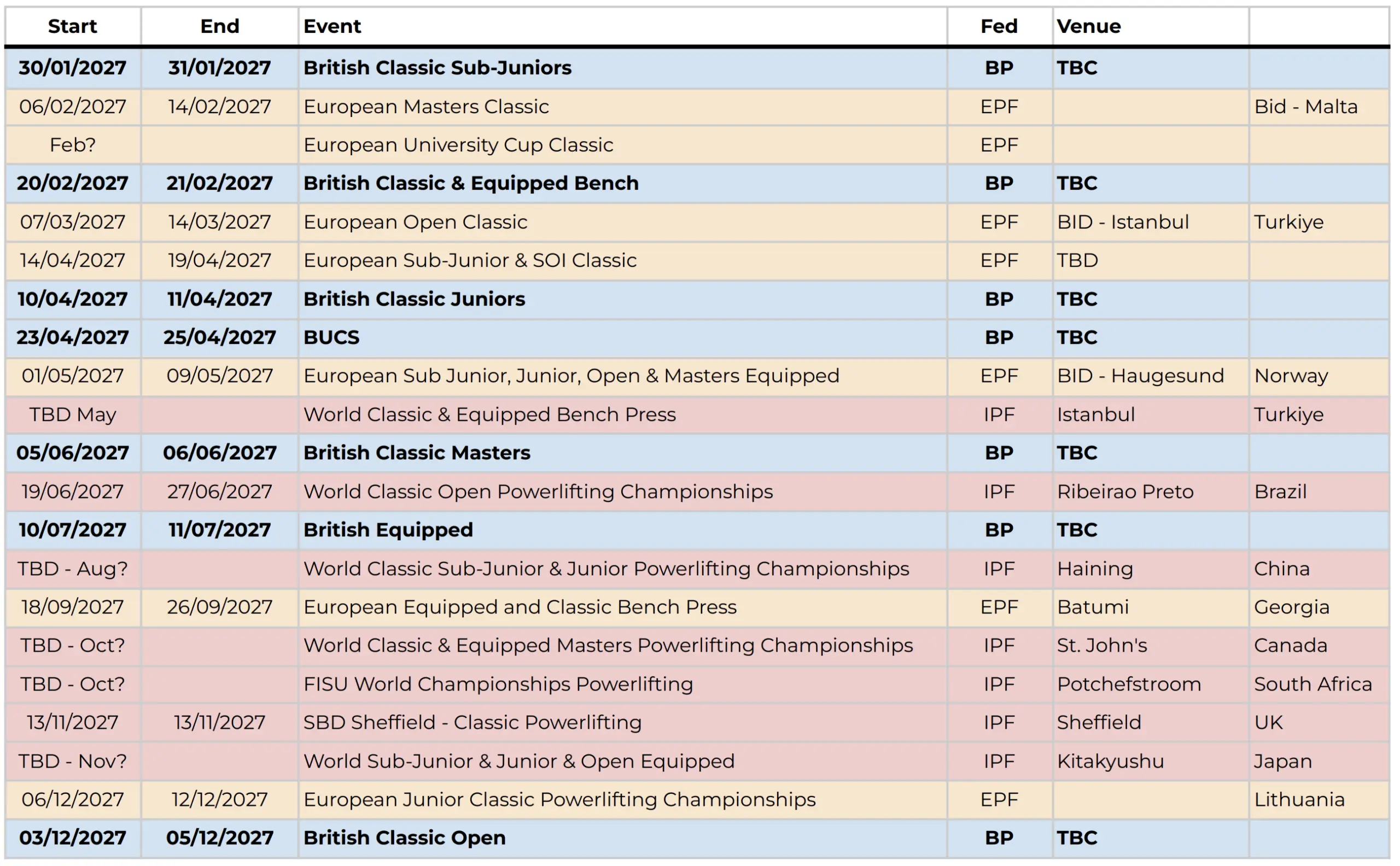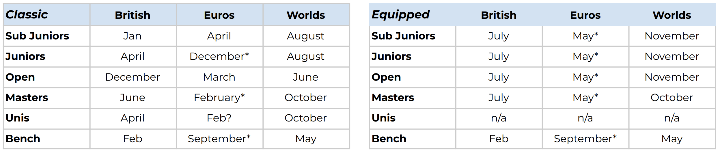 - British Equipped – moving this to July fits in better for all age categories. There is the 4-5 week turnaround to the European Cup (formerly Western Euros), however, this is generally aimed at developing athletes and is cancelled in 2027 in any event. 6 The calendar is more spaced out, and whilst we have an extra event in the diary, it equates to the same amount of competition days.