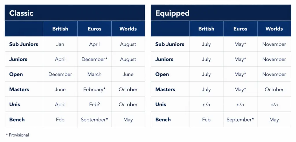 Check out all the upcoming championships from British Powerlifting and you can find all the International Competitions from the IPF Calendar.
