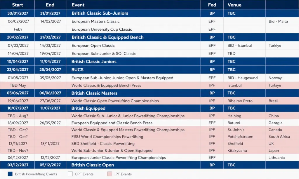 You can also see many of our nationals are still inviting bids. If you would like to send a bid in to host a National Championships, please email competitions@britishpowerlifting.org to discuss it further.