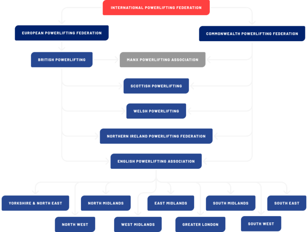 The GBPF is affiliated to the International Powerlifting Federation and the European Powerlifting Federation. It comprises the Home Countries of England, Wales, Scotland and Northern Ireland. England is further split into nine geographic regions or divisions. The following diagram shows British Powerlifting in relation to it’s constituent Home Nations and Regions and how these all fit together within the broader IPF Community.